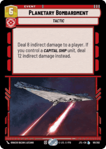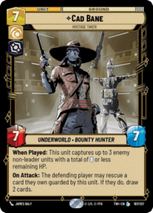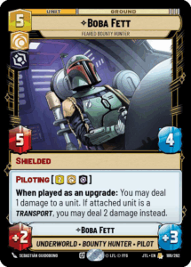 We see Cham Syndula to help catch up in resources against Admiral Piett, another top performer in the previous and current metagame. While Command decks play cards like Resupply, Cham allows us to develop a body on board and equalize the resource discrepancy. Finally, we have Planetary Bombardment and Cad Bane – Hostage Taker for when we need to pivot to a more top end control style gameplan. This versatility to switch while maintaining the majority of our deck was one of Jango’s greatest strengths.