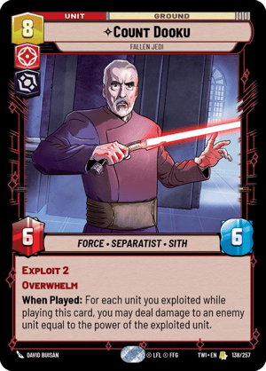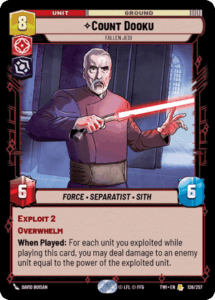 Boba Fett – Feared Bounty Hunter was a spicy one-off inclusion. It being shielded and coming down on 5 resources meant that it could take out pesky leaders like Obi-Wan and Anakin when combined with a surprise attack. The use of the piloting keyword, while not triggering Jango’s ability, also gave the deck some early game aggression in space. Count Dooku – Fallen Jedi offered very similar strengths, being able to take out more irrelevant early game units to deal some damage, develop a 6/6 with Overwhelm, and even exhaust a unit when combined with Jango’s ability. This was another way to take out hard to remove leaders.