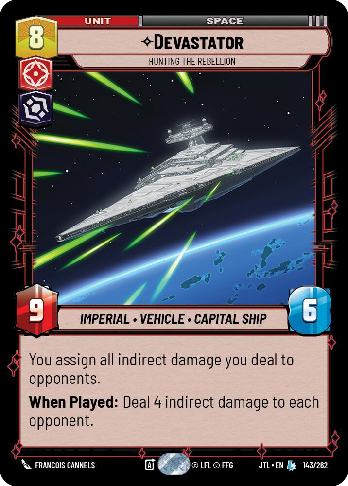 Rounding out the more staple inclusions are IG-2000, Ruthless Raider, and War Juggernaut, acting as large sources of direct damage to units. War Juggernaut and Ruthless Raider were some of Jump To Lightspeed’s biggest power boosts to the Jango Fett deck, really tipping the deck over the top, allowing him to exhaust entire boards when Jango was deployed. Devastator – Hunting The Rebellion was the natural top end of the deck, providing a giant body on the field and dishing out even more indirect damage.