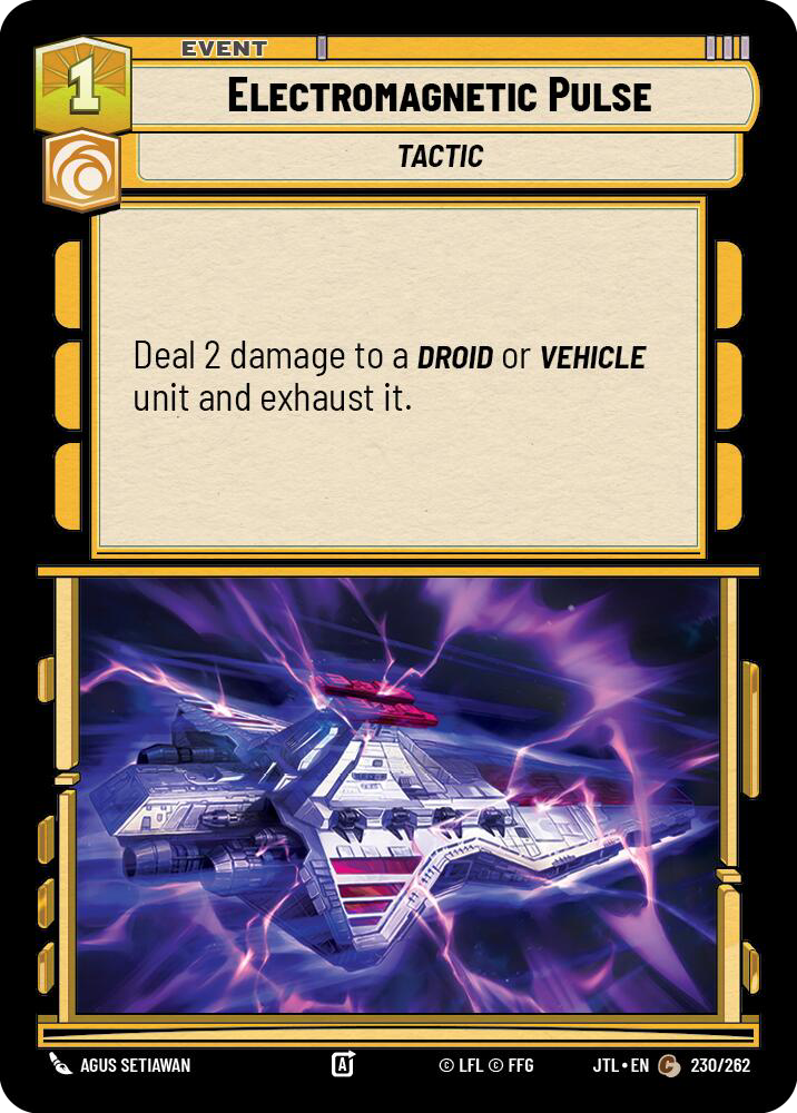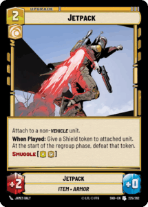 The following cards may have differed from deck to deck, however, Jędrzej did highlight why these cards were chosen by his team and why they were integral to the metagame at the time. Electromagnetic Pulse performed very well in the Jango Fett mirror, allowing you to keep up one resource to exhaust whatever vehicle played from Triple Dark Raid or Sneak Attack. It also was good against decks that played Commandeer as it essentially wasted their whole turn. Jetpack was a great way to get a shield on an essential unit of yours to prevent it from getting damaged or exhausted as well. More tech for the mirror and having Smuggle made it very versatile.