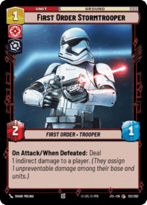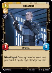 Most Jango Fett decks ran a very similar core build, utilizing aggressive units with damage effects to maximise the use of Jango Fett’s leader ability. On the low end we saw First Order Stormtrooper, Greedo, and ISB Agent all packing ways to potentially deal damage to opposing units while still putting on some early aggression. The combination of ISB agent and Tarkintown also helps remove an early threat from your opponent and already solidifies control over the field.