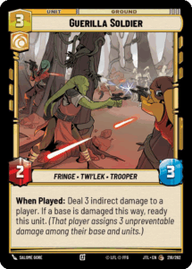 Crafty Smuggler and Seventh Fleet Defender were nice inclusions for the mirror matches and potential Quinlan Vos matchups as the shield it provides itself allows it to swing or trade into other ground units. Elite P-38 Starfighter and Guerilla Soldier, continue to deal instances of damage to exhaust opposing units while continuing to use other units to put on pressure and whittle down the enemy life total.