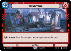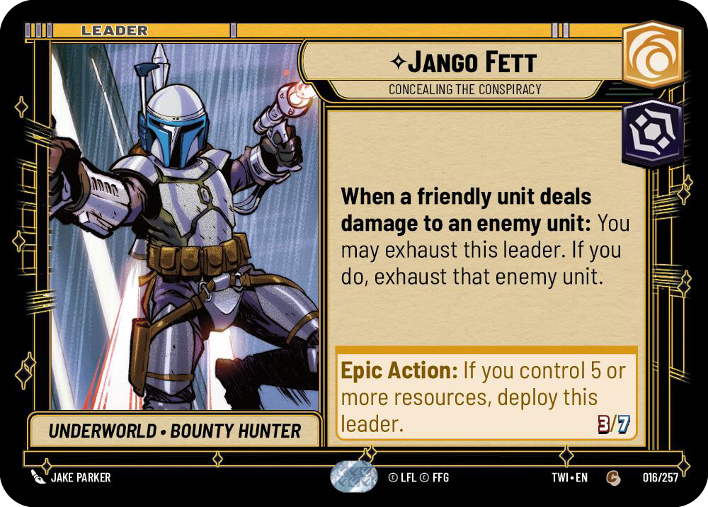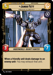 Starting from the top, Jango Fett – Concealing The Conspiracy is a Cunning Villany leader that deploys at 5 resources. His leader side has the ability “When a friendly unit deals damage to an enemy unit: You may exhaust this leader. If you do, exhaust that enemy unit.” On the unit side, he may perform this effect as many times per round as possible without exhausting, which led to some oppressive play patterns. We also see the use of Tarkintown as the base of choice, a 25 health base with the Epic Action of being able to deal 3 damage to a damaged non-leader unit.