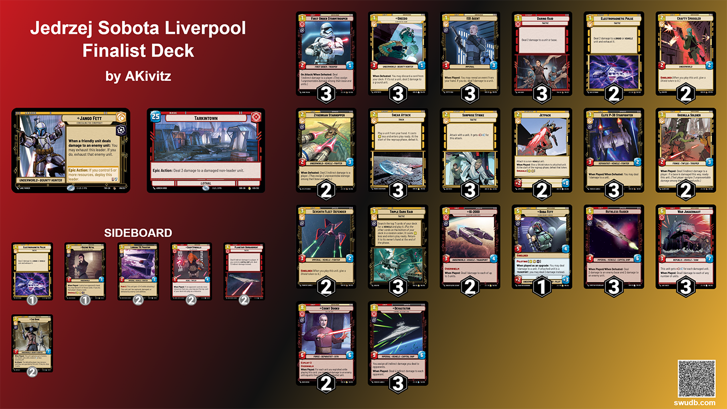 Initially prepared for Lille, we expected Jango Fett Tarkin Town to be the premier deck in the format. With the recent suspensions of Jango Fett, Triple Dark Raid, and DJ, we fully expect things to shake up. So in part one of this series, we will be going over the decklist that made it to the finals of Sector Qualifier Liverpool, why the deck performed so well, what made it so versatile, and a little bit on why these suspensions were a good idea in the first place. Hopefully, using the fundamentals of what made Jango such a versatile deck, we will lead into part two where we go over what we predict to be strong metagame choices and why they will perform well.