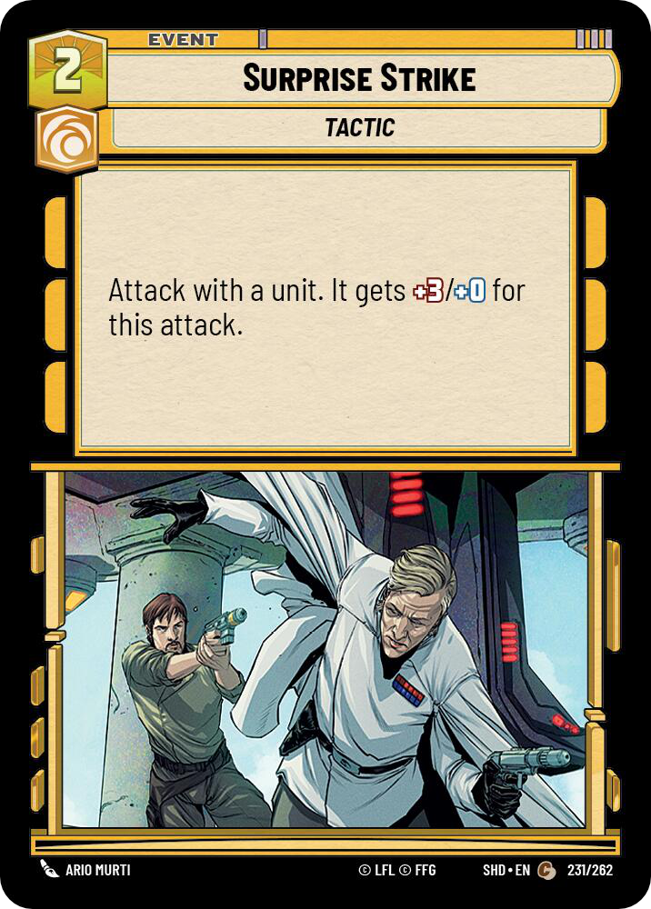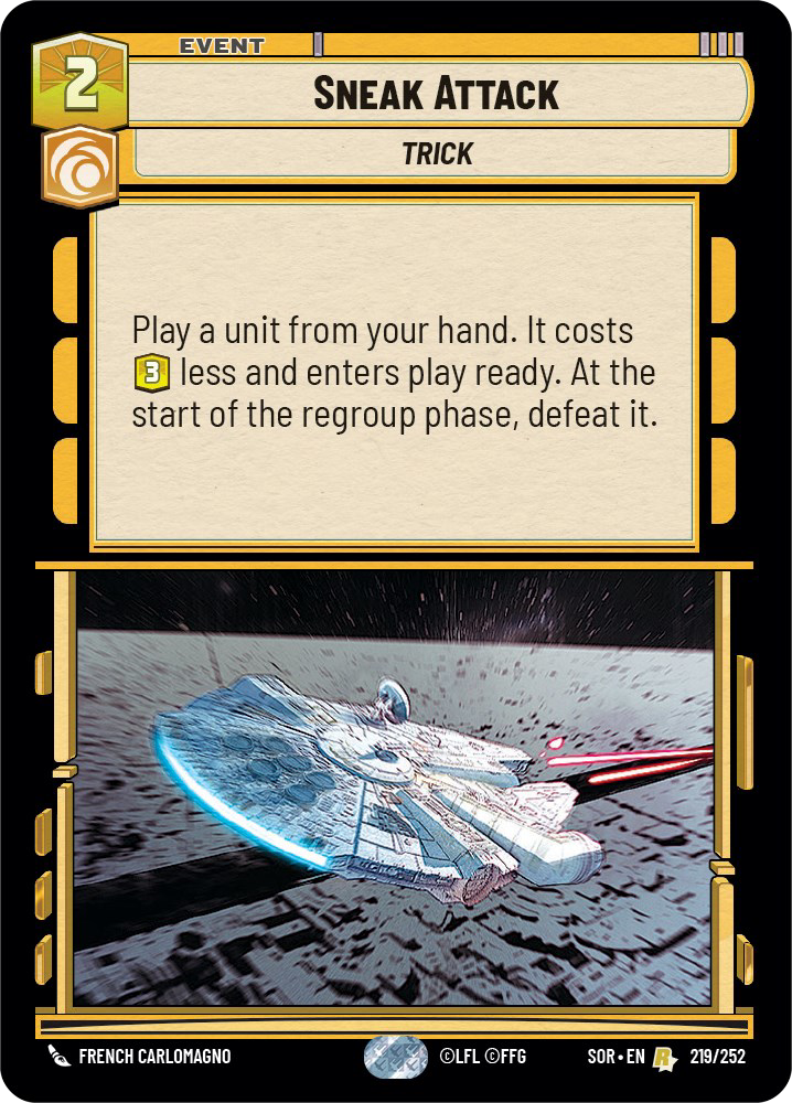 Daring Raid fits well into a tempo based gameplan, helping finish off units low on health for the low cost of one resource. The added benefit of being able to point this damage at the base also can help in a pinch against heavy control decks. Sneak Attack offers similar benefits to Triple Dark Raid, being able to play higher cost units earlier and having them enter ready. However, these cards would be sacrificed at the end of the regroup phase. Rounding out the core events of the deck we have Cunning all-star Surprise Strike; three extra damage on an attack can finish off larger units – or just end games outright.