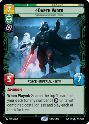 When looking to play a card, you must exhaust resources equal to the number shown to pay for the cost of the card. You then look at the symbols below the number and check to see if you have access to the available aspects. Because your Leader Luke Skywalker – Faithful Friend provides you access to Heroism Aspect, and your Base provides you with the Cunning Aspect, you do not need to pay any additional costs. If you wanted to play Poe Dameron – Quick to Improvise however, he would cost you 5 resources, plus an additional 2 because you do not have access to the Aggression Aspect. Darth Vader – Commanding The First Legion would cost you a whopping 11 resources to play if you wanted to play him in this deck.
