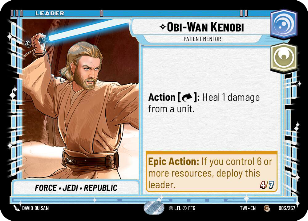 Lastly, there is the Epic Action on the Leader card. Epic Actions are actions that can be performed only once per game. These Epic Actions that appear on Leader Cards will often be to deploy your Leader flipped over as a Unit into an arena. Notably, using an Epic Action does not cost resources. Epic Actions are immediately available once you reach the amount of resources necessary for the action. While it is on the Leader Unit side, it still contributes its aspects as normal. You cannot use the actions on the Leader side while it is deployed as a Unit.
