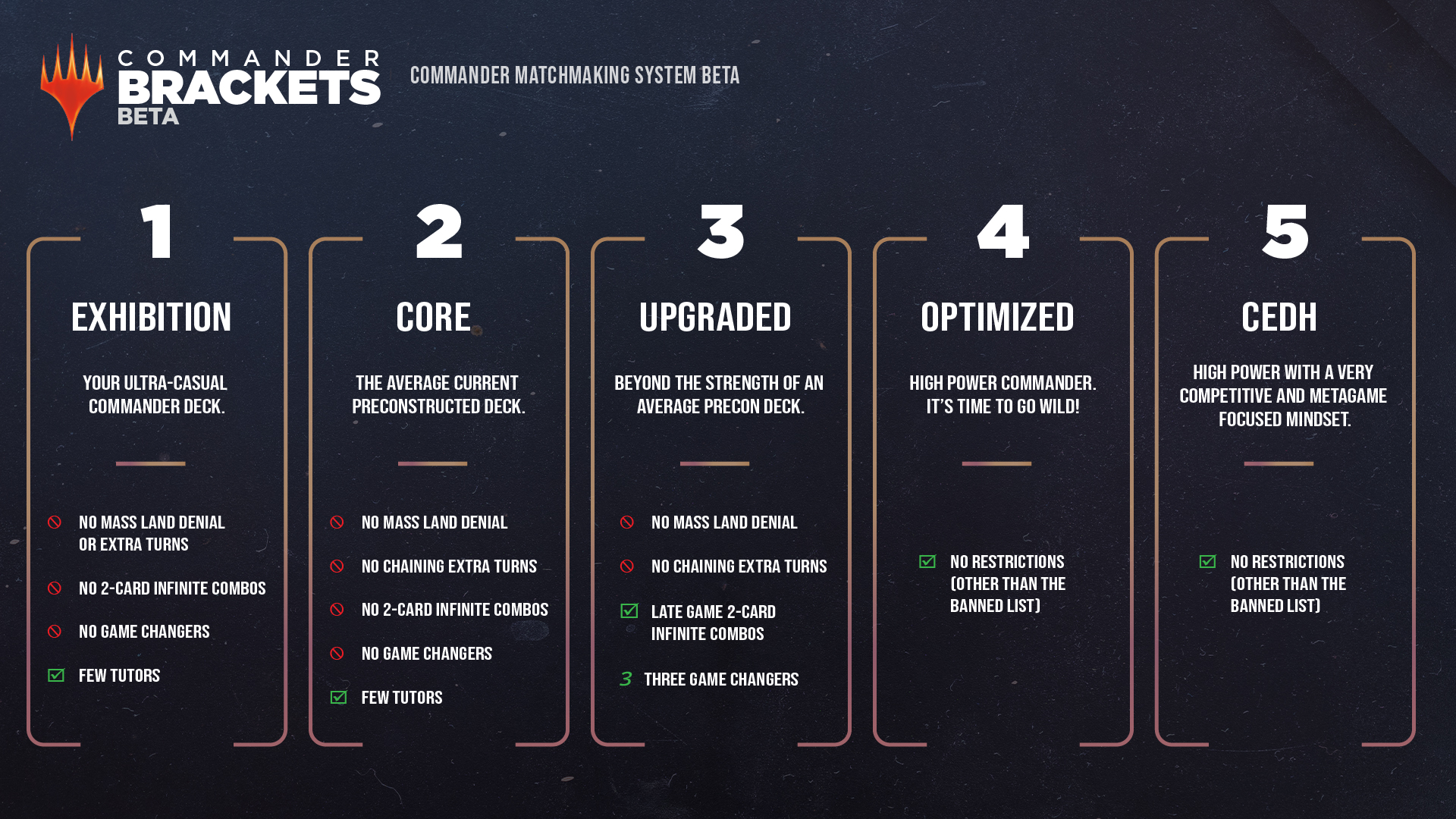 In the graphic shared by Wizards of the Coast, we see each bracket has a small breakdown of what defines a deck to be within that bracket. The main points of differentiation between the brackets are the use of certain gameplay strategies, the level and strength of infinite-combos, the inclusion of a new classification of cards called “Game Changers”, and the amount of Tutors in the deck.